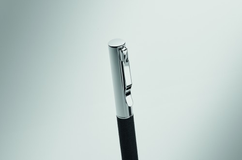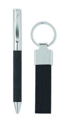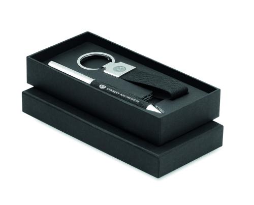 2 piece gift set in gift box. Including metal twist ball pen with RPET polyester detail and RPET polyester key ring. Blue ink.