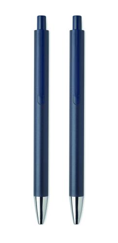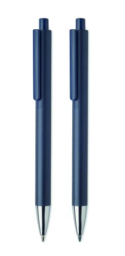 Recycled aluminium pen set with 1 push button ball pen and 1 graphite inkless pen. Blue ink. Presented in recycled paper box.