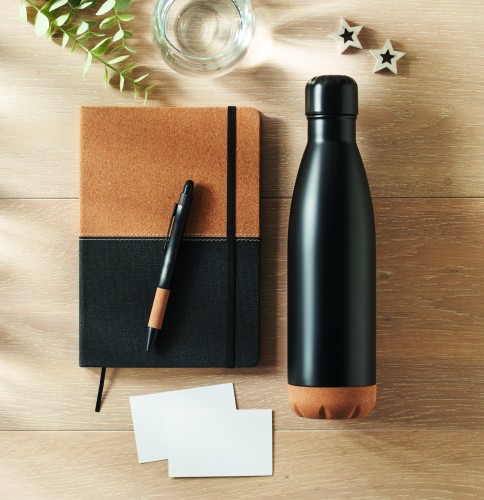 3 piece gift set including a double wall stainless steel insulated bottle 500ml, A5 notebook with hard RPET and cork casebound cover with 160 lined recycled paper pages (80 sheets) and an aluminium push ball pen. Blue ink. FSC®-certified | FSC MIX CREDIT, P7.1, N3.7, FSC-C213206