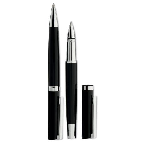 Pen set made from brass and stainless steel in a gift box. Twist ball pen blue ink and roller pen black ink.