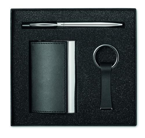 Business gift set including metal twist ball pen, zinc alloy with PU keyring and card holder. Presented in a box. Black ink.