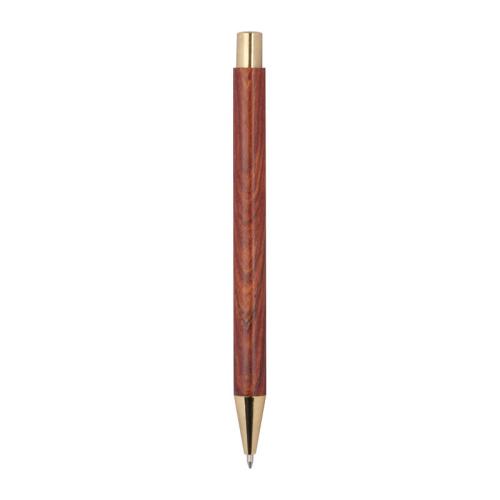Ballpen with push mechanism and wooden coating, blue-writing big refill and golden applications.