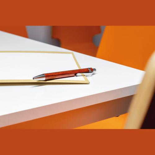 Ballpoint pen made of lacquered wood with a blue-writing refill and silver applications.