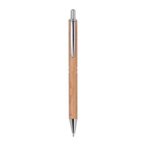 Wooden ballpoint pen with a blue refill, silver applications and two notches arround the barrel.
