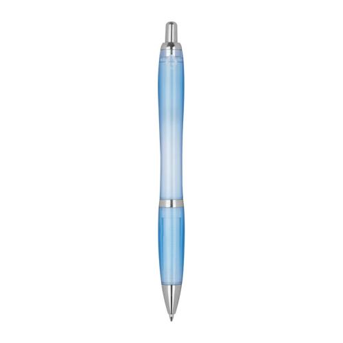 Classic ballpoint pen made of RPET, transparent with silver applications, rubber sleeve and large-capacity blue refill.