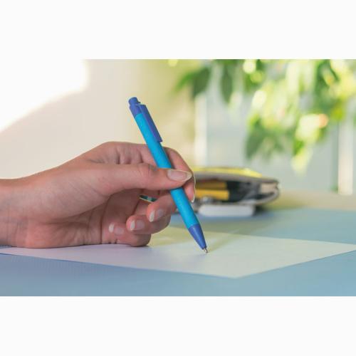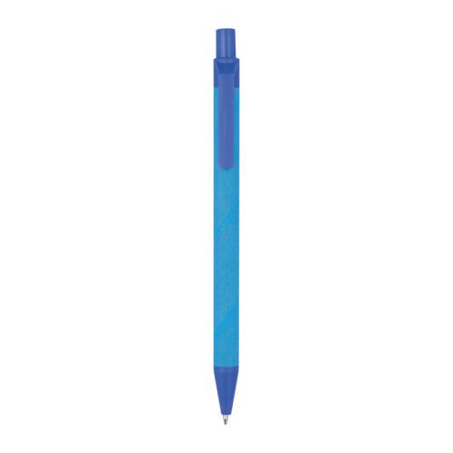 Blue-writing ballpoint pen made from recycled paper, the coloured applications are made from corn.