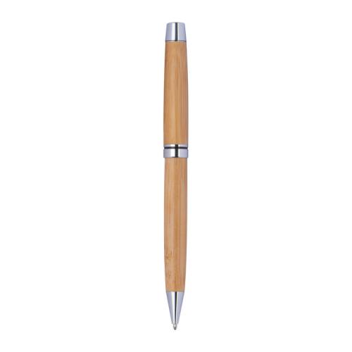 Wooden ballpen with twist mechanism, metal applications and blue-writing refill.