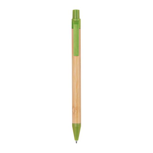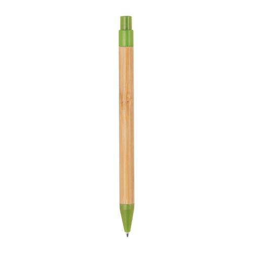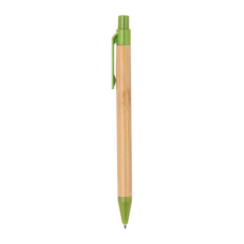 Retractable bamboo ballpen with coloured wheatstraw applications and a blue-writing refill.