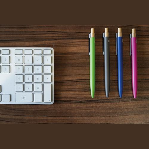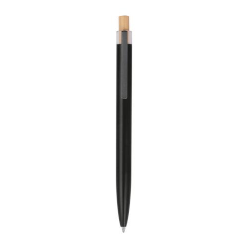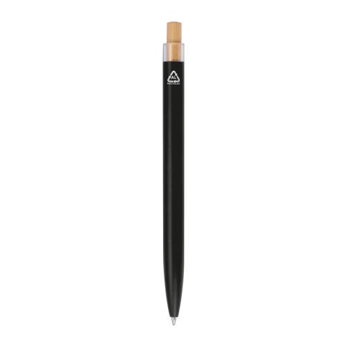 Recycled aluminium ballpen with metal clip, blue refill and bamboo pusher.