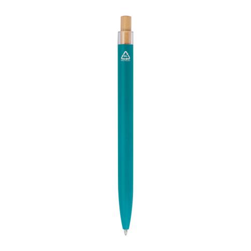 Recycled aluminium ballpen with metal clip, blue refill and bamboo pusher.