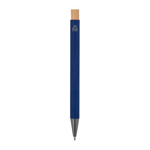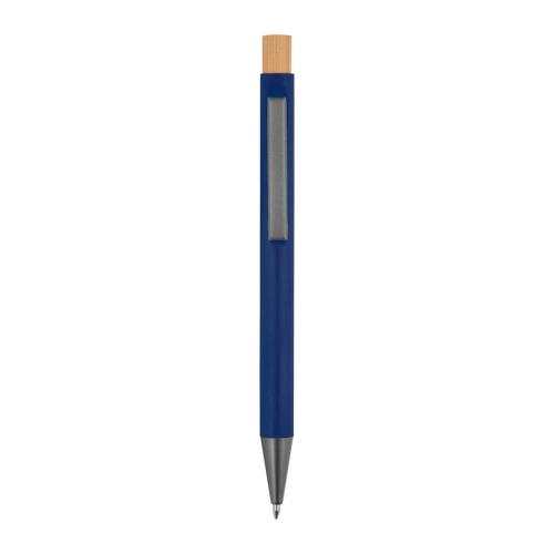 Recycled aluminium ball pen with bamboo pusher, metal clip and large capacity refill with blue ink.