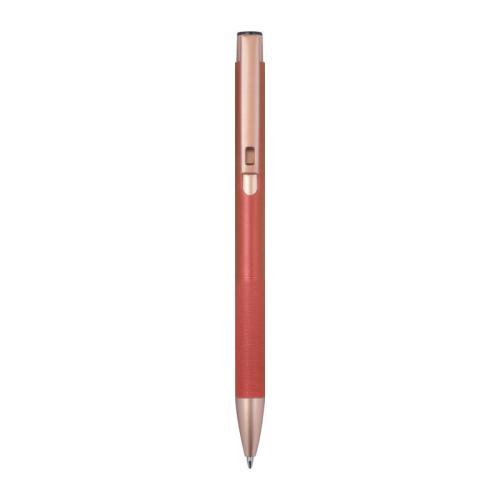 Ballpoint pen made of recycled aluminum with a matte finish and rose gold accents, equipped with a blue-writing large-capacity refill and a diamond-patterned grip zone.