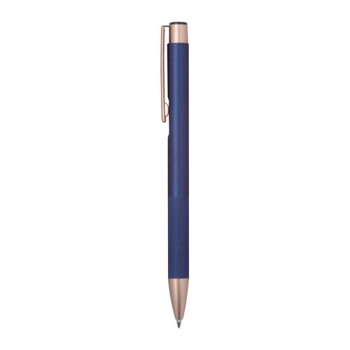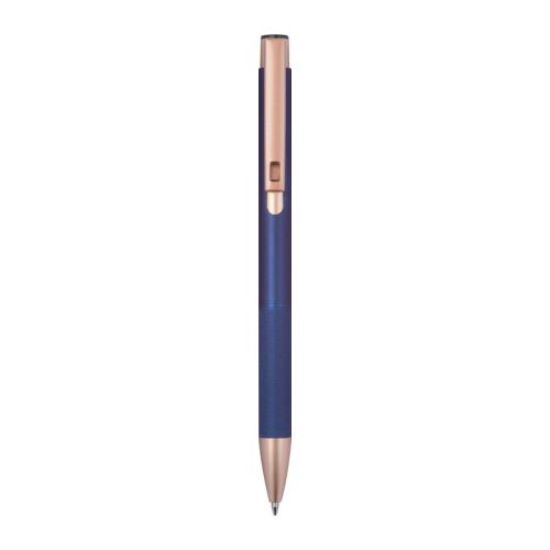 Ballpoint pen made of recycled aluminum with a matte finish and rose gold accents, equipped with a blue-writing large-capacity refill and a diamond-patterned grip zone.