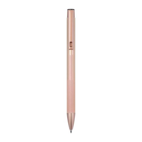 Ballpoint pen made of recycled aluminum with a matte finish and rose gold accents, equipped with a blue-writing large-capacity refill and a diamond-patterned grip zone.