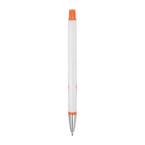 White ballpoint pen made from recycled plastic (RABS) with blue ink refill.
