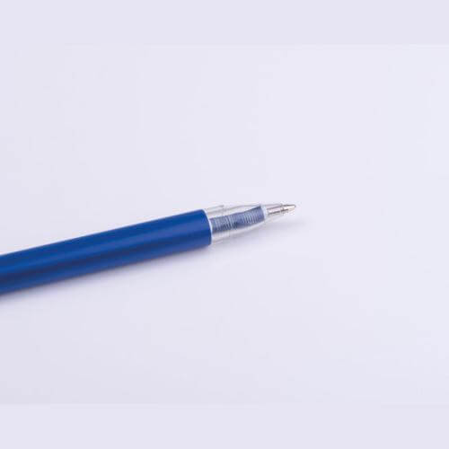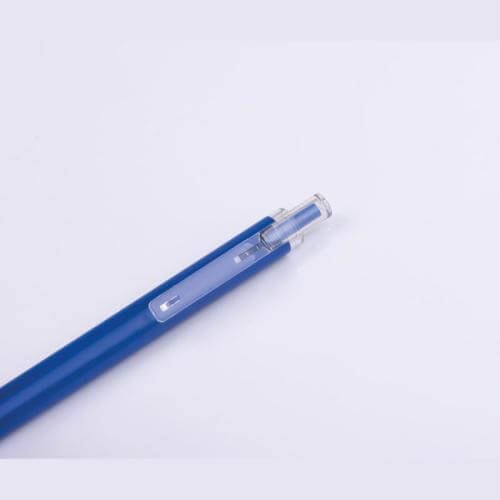 Ballpoint pen made from recycled aluminum and recycled plastic (RPET) with transparent clip and blue ink refill.