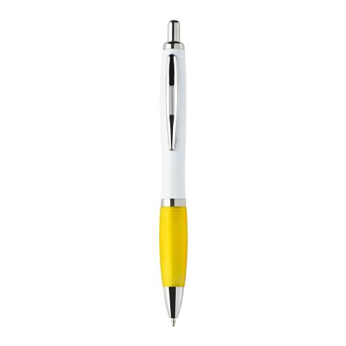 Recycled ABS plastic ballpoint pen with white barrel, coloured grip and chrome parts. With blue refill.