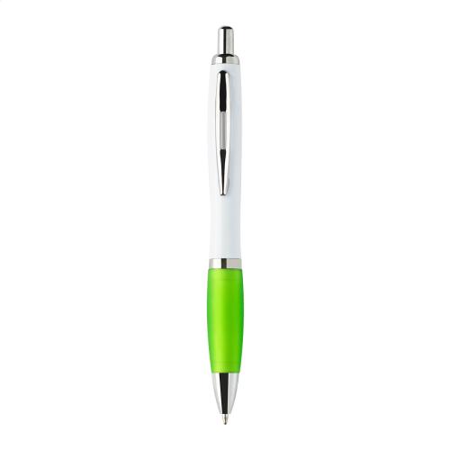 Recycled ABS plastic ballpoint pen with white barrel, coloured grip and chrome parts. With blue refill.