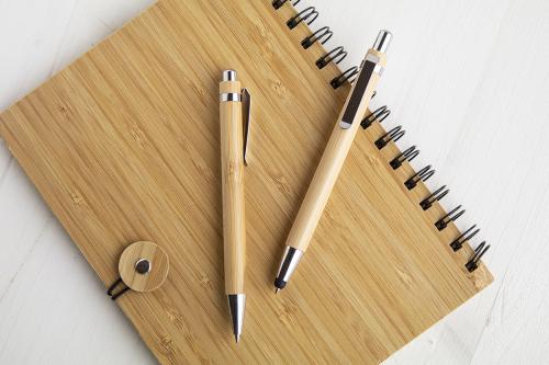 Bamboo ballpoint and touch screen pen with metal clip and tip. With blue refill.