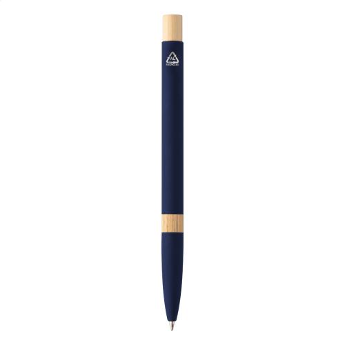 Recycled aluminium ballpoint pen with bamboo parts, rubberized finish and chrome clip. With special coating for mirror laser engraving. With blue refill.