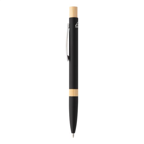 Recycled aluminium ballpoint pen with bamboo parts, rubberized finish and chrome clip. With special coating for mirror laser engraving. With blue refill.