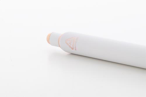 Recycled aluminium ballpoint pen with rubberized finish and rose gold details. With special coating for mirror laser engraving in rose gold colour. With blue refill.