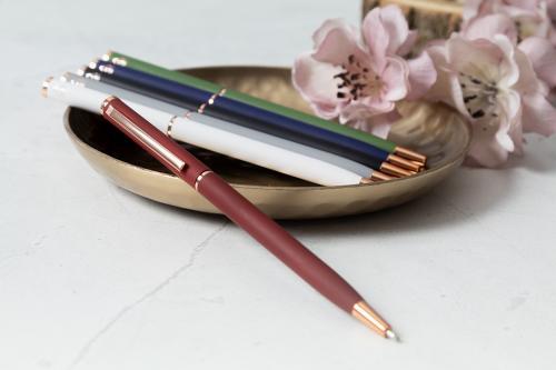 Recycled aluminium twist ballpoint pen with rubberized finish and rose gold details. With special coating for mirror laser engraving in rose gold colour. With blue refill.