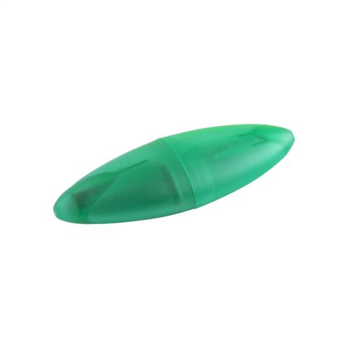 Capsule shaped plastic highlighter in translucent housing.