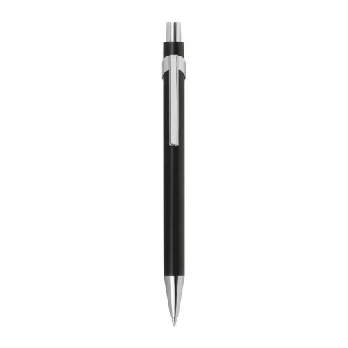 Metal ball pen in different colours, with silver applications and blue-writing refill.