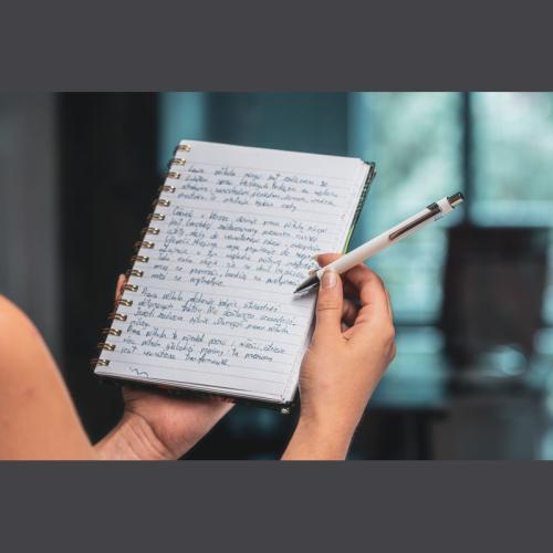 Metal ball pen in different colours, with silver applications and blue-writing refill.