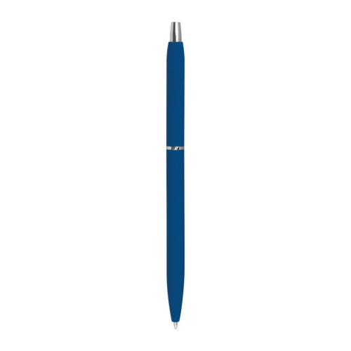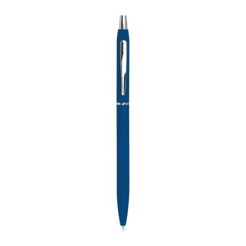 Slim, rubberized metal ball pen in different colours, with silver applications and black-writing refill.