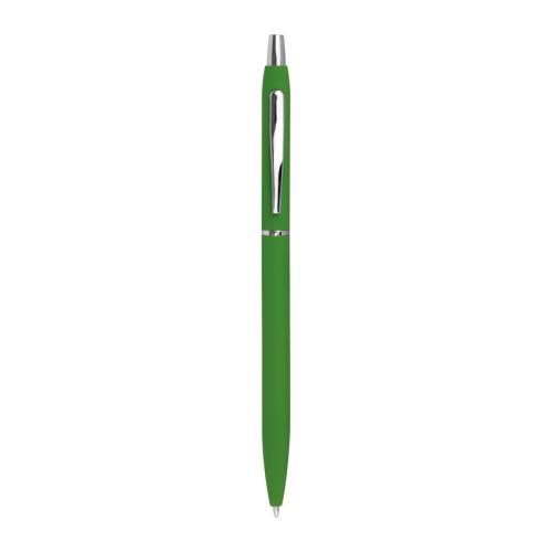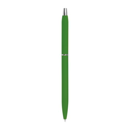 Slim, rubberized metal ball pen in different colours, with silver applications and black-writing refill.