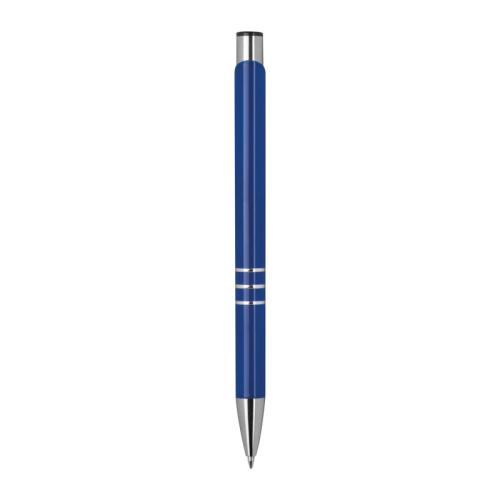Fully lacquered metal ball pen with 3 decorative rings and blue-writing refill with large capacity.