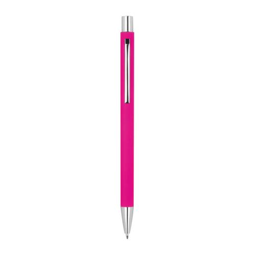 Slim metal retractable ball pen with silver applications and blue-writing refill.