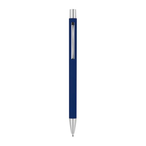 Slim metal retractable ball pen with silver applications and blue-writing refill.