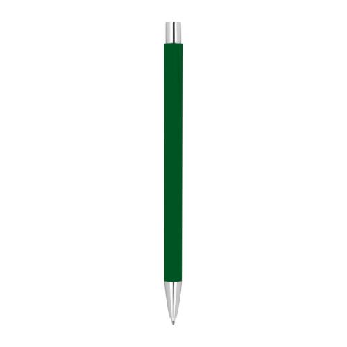 Slim metal retractable ball pen with silver applications and blue-writing refill.