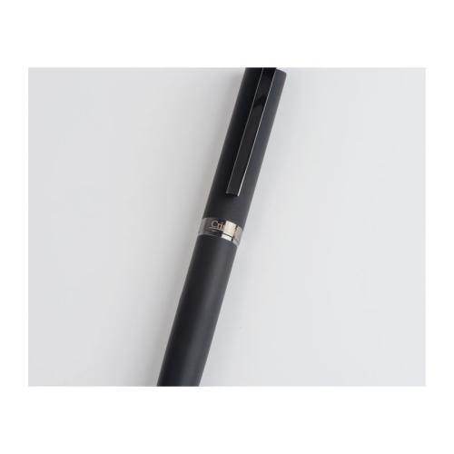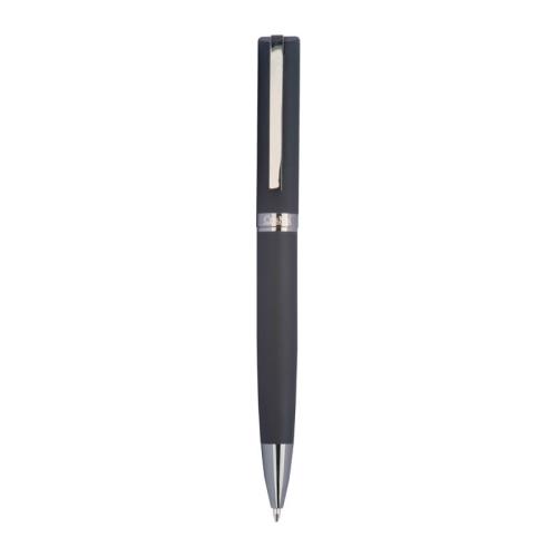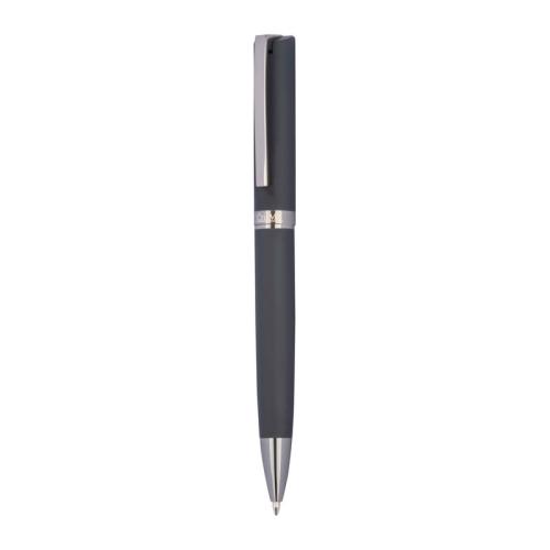 Twist action ball pen made of metal and rubberised surface in a classic design with a large capacity refill that writes in blue. The biros is supplied in a black case.