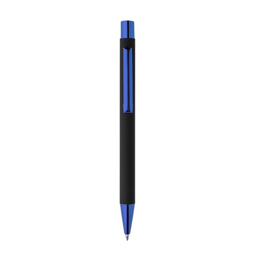 Recycled aluminium ballpoint pen with black rubberized body and coloured shiny metallic finish parts. With special coating for mirror engraving matching the metallic parts. With blue refill.