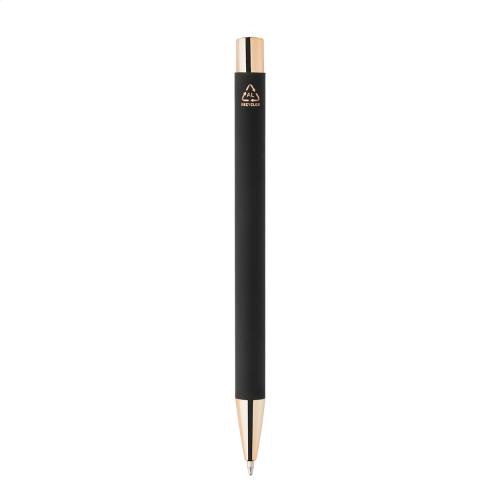 Recycled aluminium ballpoint pen with black rubberized body and coloured shiny metallic finish parts. With special coating for mirror engraving matching the metallic parts. With blue refill.