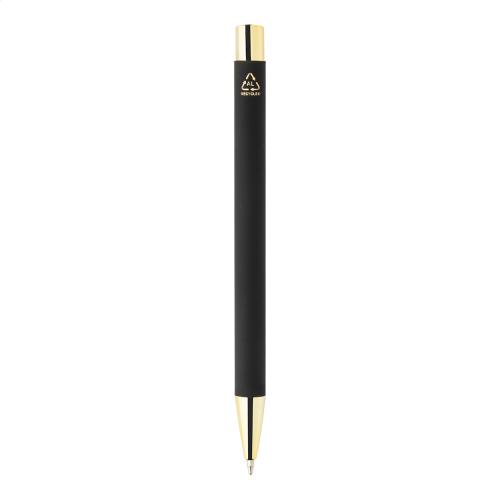 Recycled aluminium ballpoint pen with black rubberized body and coloured shiny metallic finish parts. With special coating for mirror engraving matching the metallic parts. With blue refill.