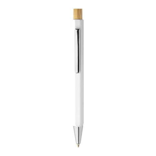 Hexagonal recycled aluminium ballpoint pen with bamboo button and chrome parts. With blue refill.