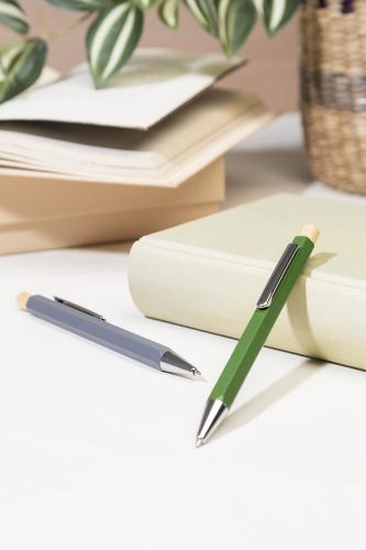 Hexagonal recycled aluminium ballpoint pen with bamboo button and chrome parts. With blue refill.