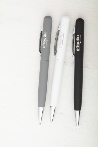 Metal twist ballpoint pen with rubberized finish and blue refill. With special coating for mirror laser engraving.