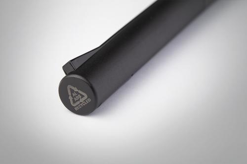 Recycled aluminium ballpoint pen in matte metallic colour, with recycled ABS upper barrel and special clip movement. With blue refill.