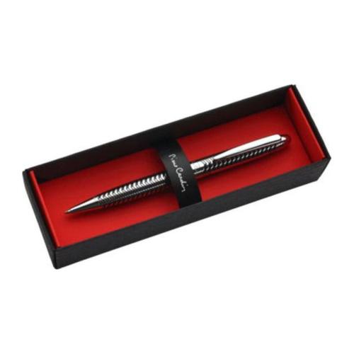 Luxury metal ballpoint pen Pierre Cardin with surface in very distinctive design. The silver body is decorated by deep engraving and black details. Pen 14.4 × 1.1 cm; Packaging 5.1 × 3.4 × 17.4 cm; Cartons (pcs): 20
