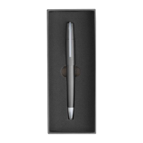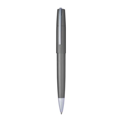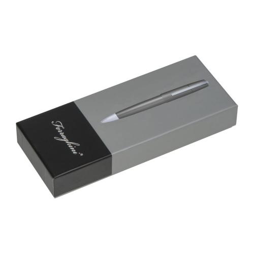 Elegant twist action ball pen from the Ferraghini brand made of metal with silver applications and a large capacity refill that writes in blue.