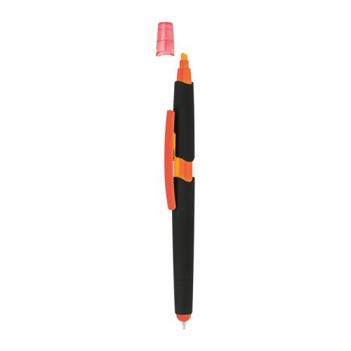 Plastic ballpoint pen with highlighter, rubberized sheath, blue-writing refill, and touch function.
