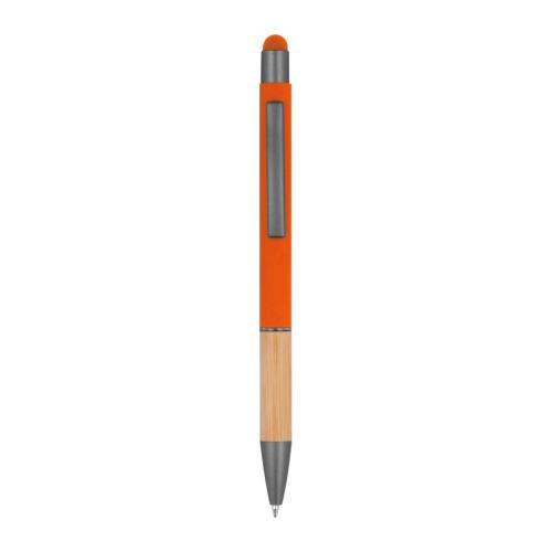 Ball pen made of aluminium with blue-writing refill, touch function, matte silver applications and a bamboo grip zone.