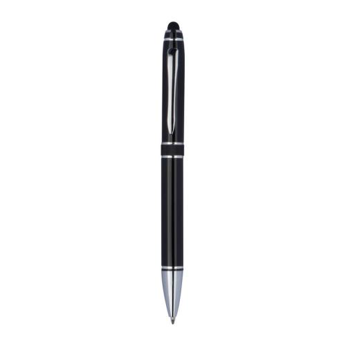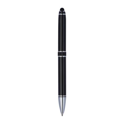 High-quality aluminium twist ball pen with blue-writing refill, silver applications and touch function in an eco-friendly case.