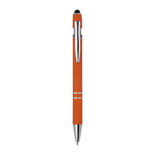 Aluminium balll pen with silver applications, blue-writing big refill, touch function and patterned grip zone.